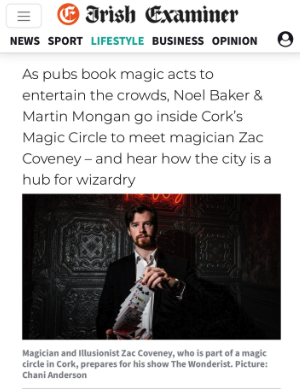 Having performed his original stage work across Ireland and the UK — including his signature show The Wonderist — Zac also works behind the scenes with other magicians, creatives, and brands to craft meaningful, unforgettable moments. His creative consulting spans everything from bespoke illusions for private clients to helping performers refine their narrative and stagecraft.